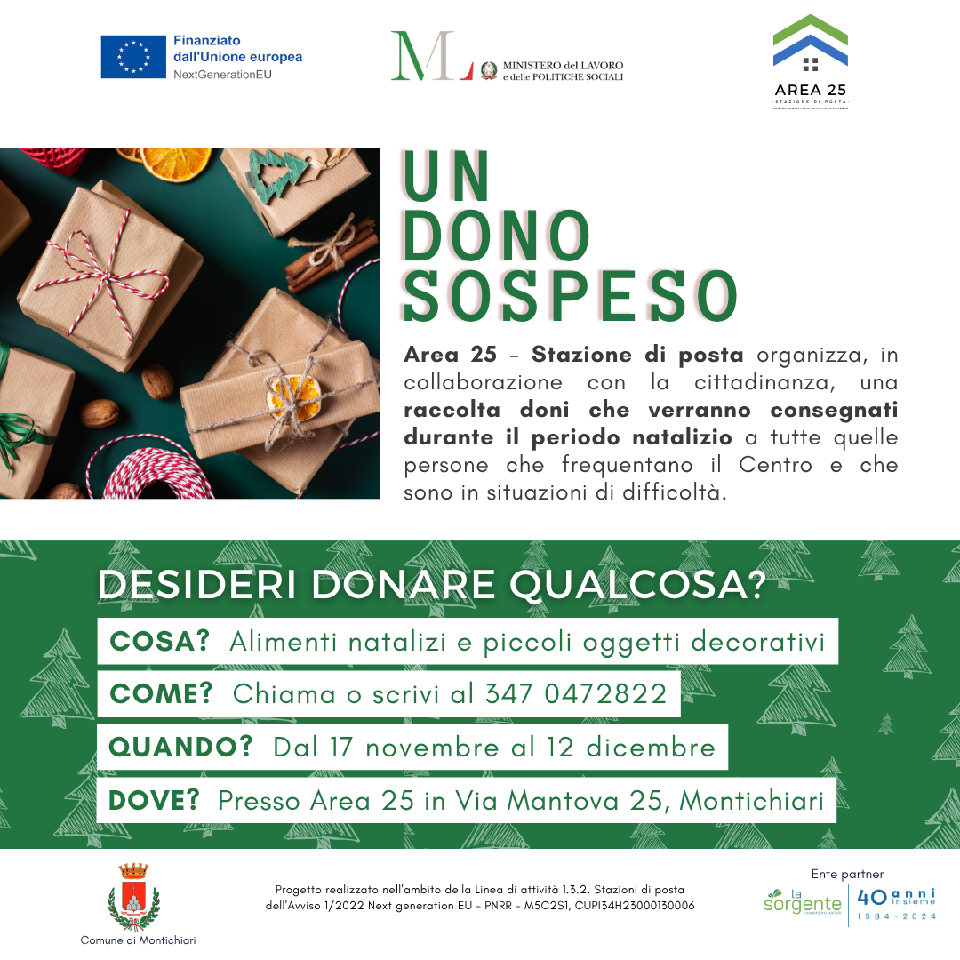 Area 25 - Stazione di posta organizza, in collaborazione con la cittadinanza, una raccolta doni che verranno consegnati durante il periodo natalizio a tutte quelle persone che frequentano il Centro e che sono in situazioni di difficoltà
